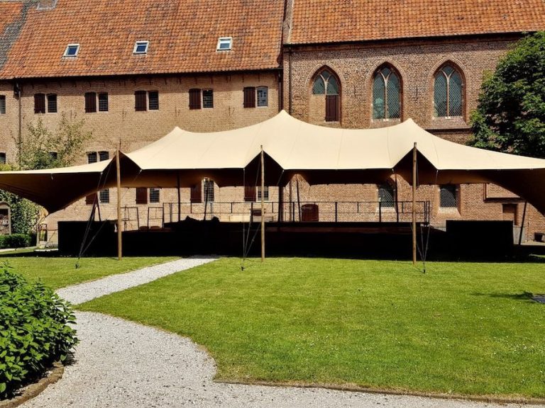 Pour l’installation d’une tente stretch de 10,5 × 10,5 mètres, une surface de 13,5 × 13,5 mètres est nécessaire.